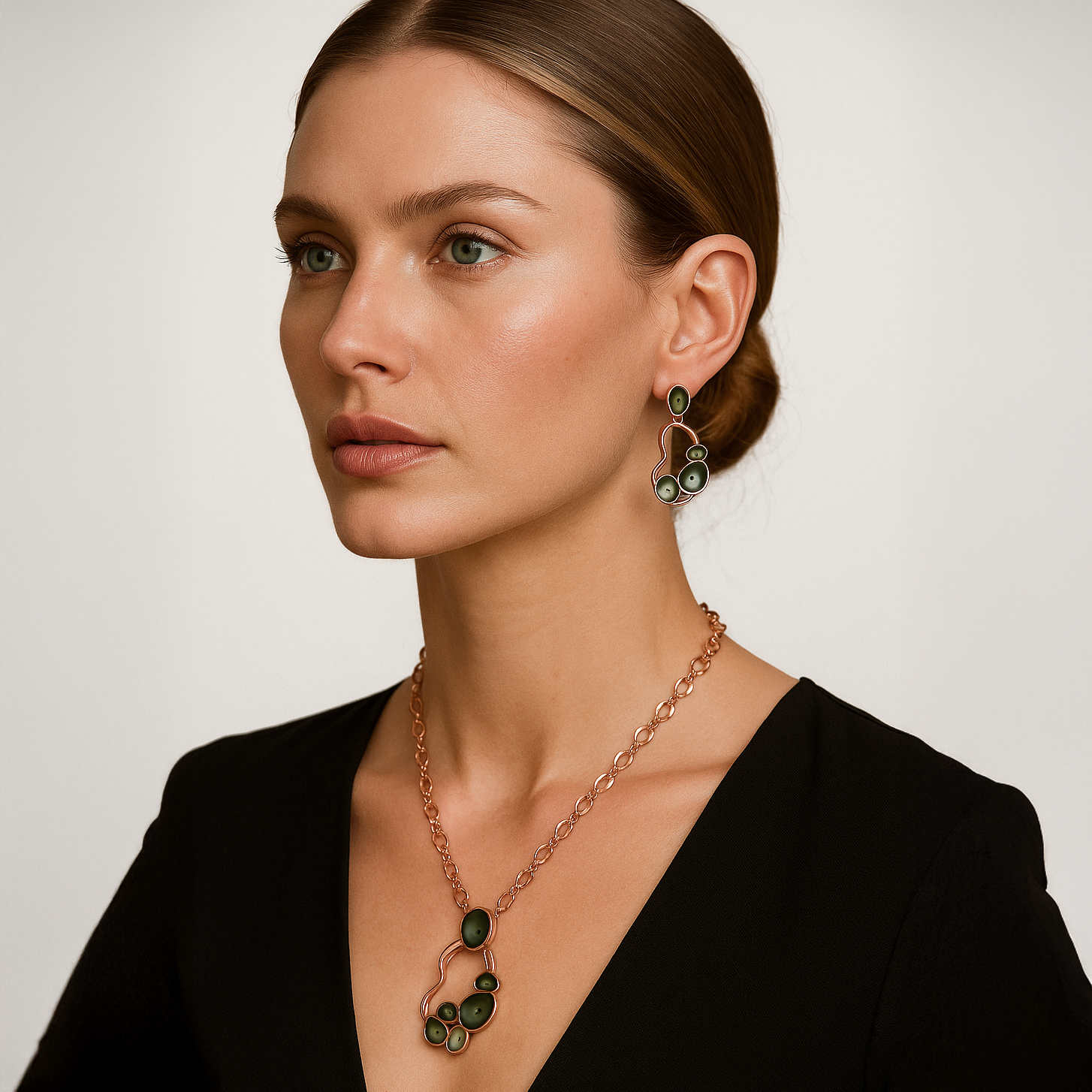 Gli orecchini coordinati completano la parure con una sinuosità discreta e raffinata.