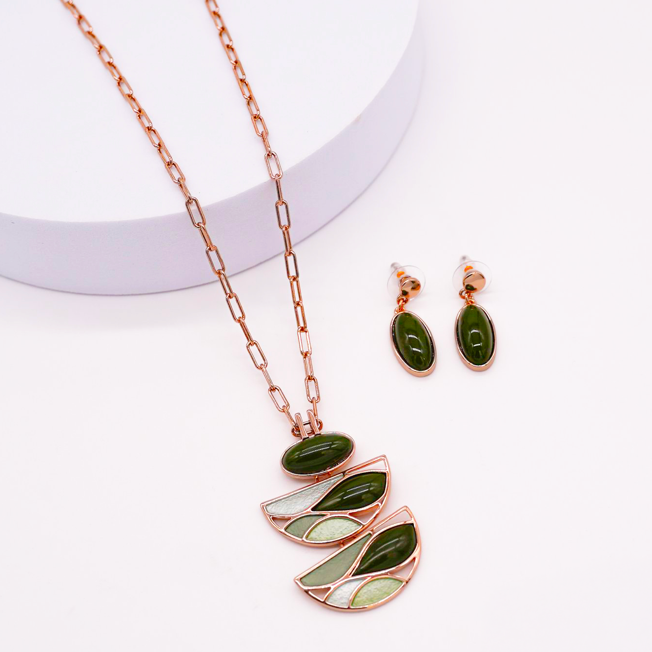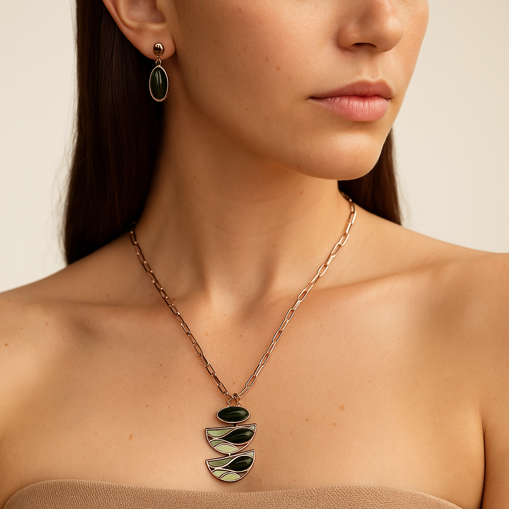 La parure Aurora Muschio unisce un design geometrico contemporaneo a tonalità calde e sofisticate.