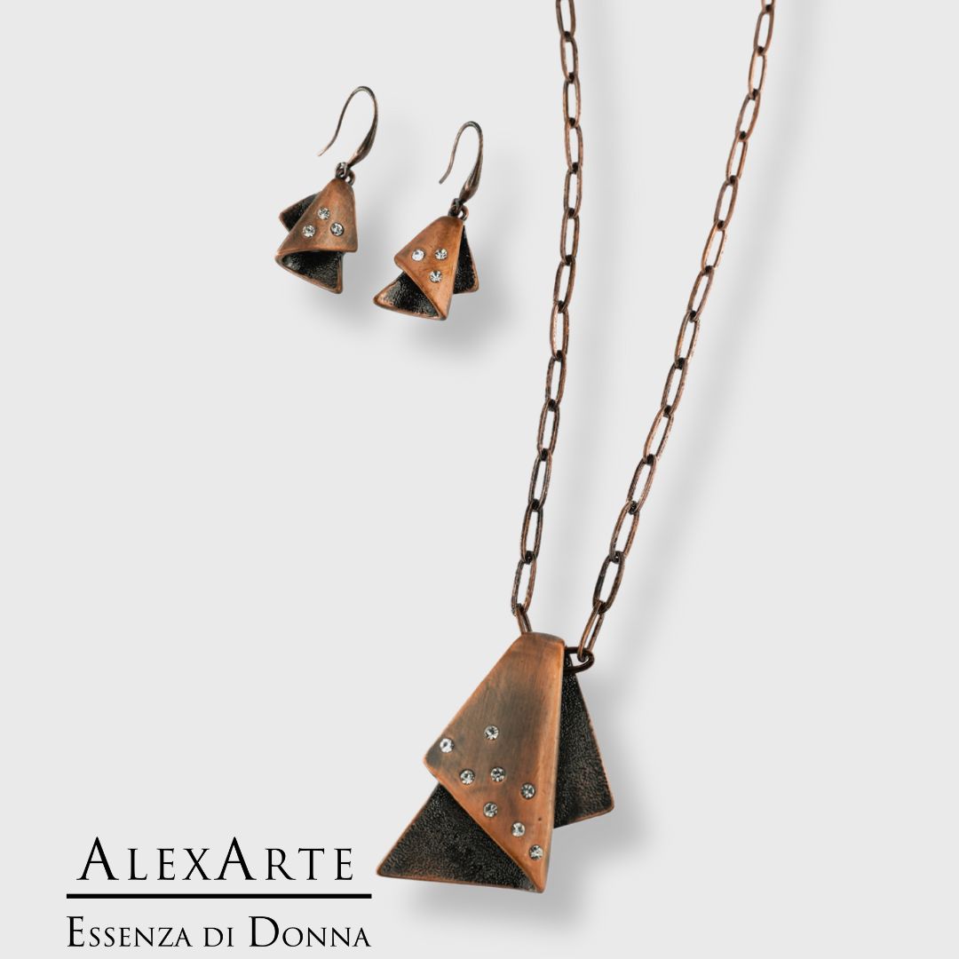 Realizzata in ottone con finitura color rame, la parure è arricchita da piccoli punti luminosi che riflettono la luce con discrezione, aggiungendo un tocco raffinato al design. Il pendente e gli orecchini creano un perfetto equilibrio tra eleganza e modernità.